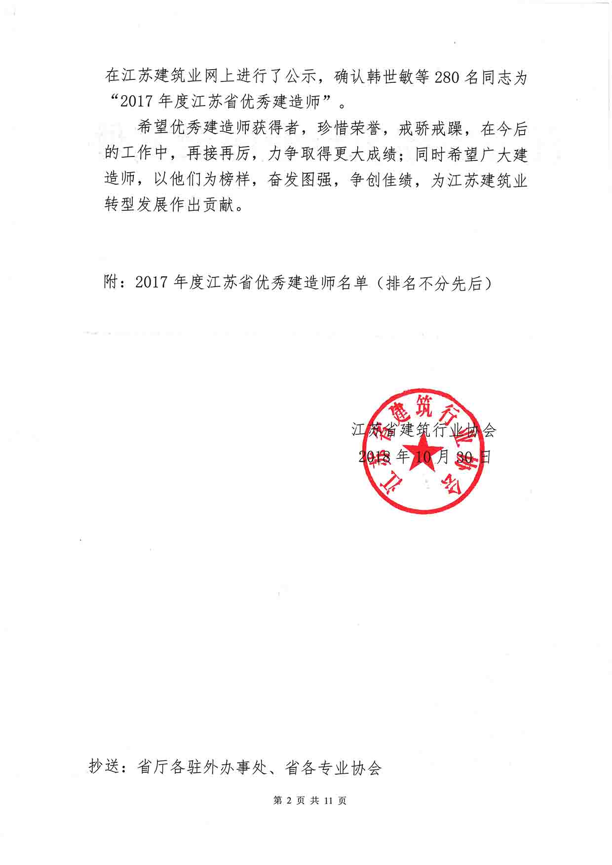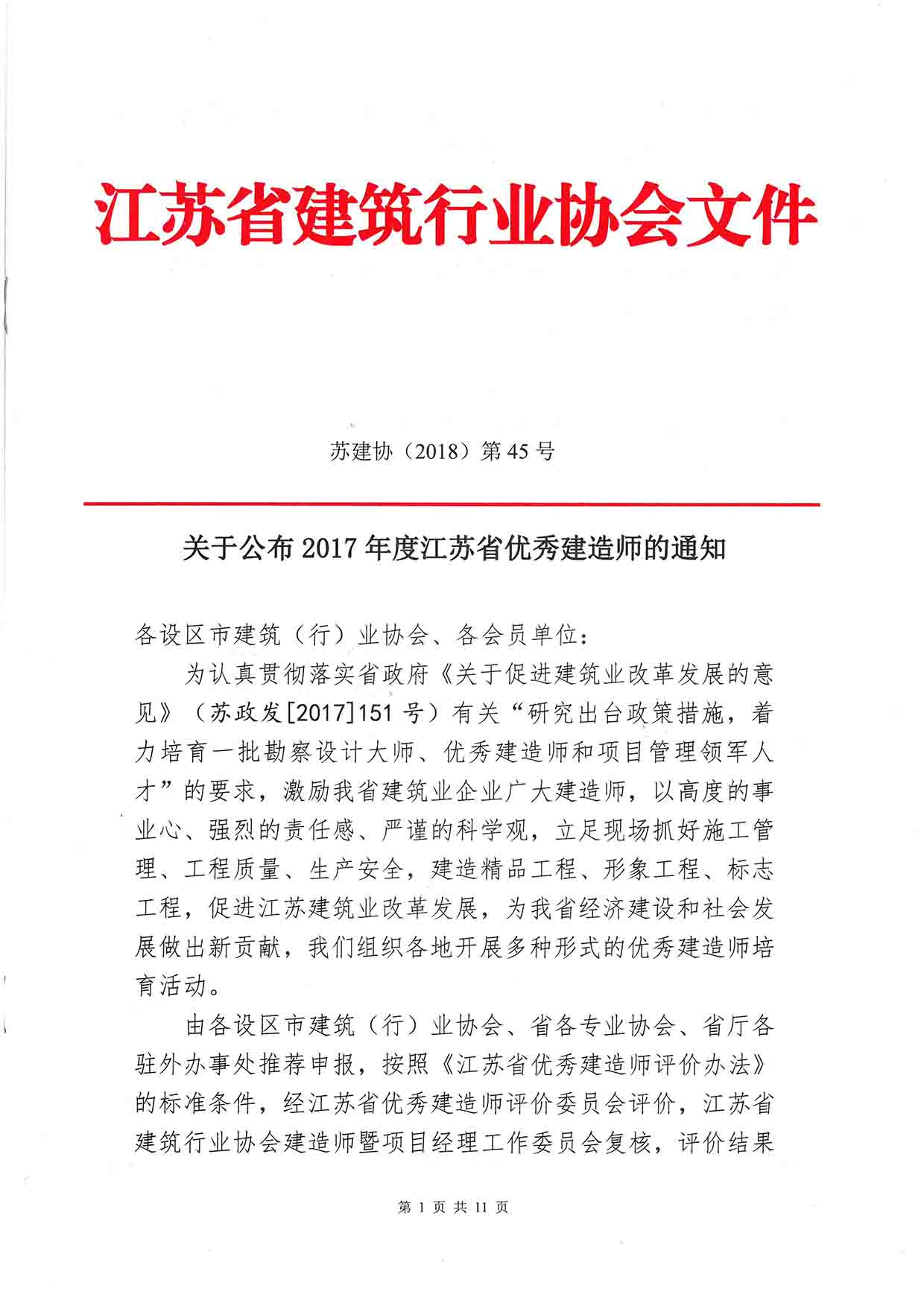 二0一八年十月,我公司優(yōu)秀員工李寧同志喜獲江蘇省建筑行業(yè)協(xié)會頒發(fā)的“2017年度江蘇省優(yōu)秀建造師”稱號!