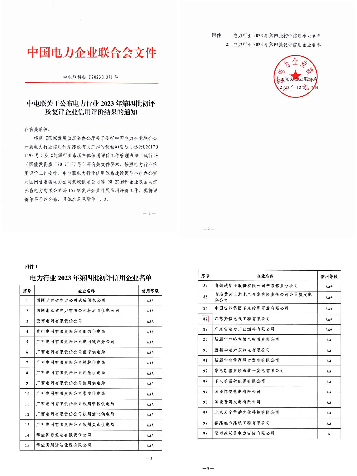 近日,根據(jù)國家發(fā)改委關(guān)于開展電力行業(yè)信用體系建設(shè)以及能源行業(yè)市場主體信用評價(jià)工作管理辦法,中國電力企業(yè)聯(lián)合會公布了一批評價(jià)結(jié)果,公司初評獲得信用等級AA+企業(yè)的稱號。公司秉承“安全、誠信、創(chuàng)新、共贏”的服務(wù)理念,高度重視企業(yè)信用體系建設(shè),專門成立了信用體系建…